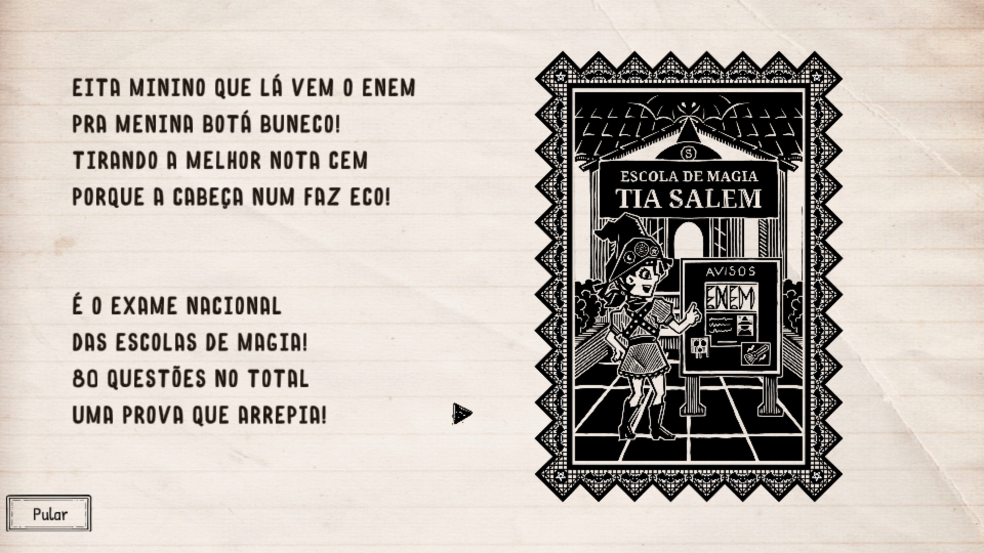 CORDELINE é um jogo de plataforma 2D no melhor estilo "runner" com artes no estilo xilogravura e versos em literatura de cordel, onde uma bruxinha precisa se avexar para chegar na prova do ENEM (Exame Nacional das Escolas de Magia), enquanto evita os monstros e armadilhas plantadas pelas bruxas arengueiras, as patricinhas da escola.